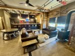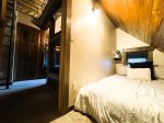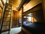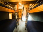 Bedroom 1 is off the kitchen and has a queen bed. Bedroom 2 is off the living area and has a queen bed. Bedroom 3 has 2 levels with a queen bed and 4 twin bunks on the main and 2 twin beds in the loft up above.