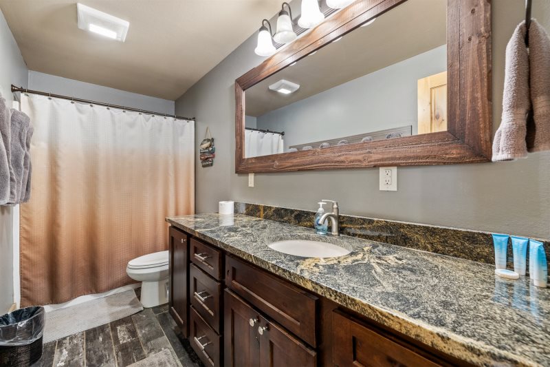 With 5 bedrooms you can sleep up to 12 guests over two open concept levels of living space. The main level has 2 queen bedrooms and a bathroom, plus a king bedroom with it's own bathroom and access to the hot tub off the back deck. Kitchen and dining area and great room with a gas fireplace are also on the main level.