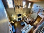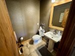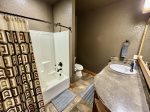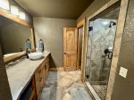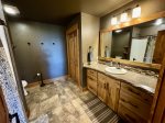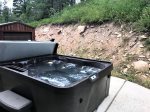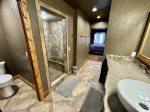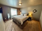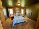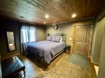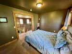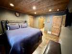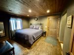 Bedroom 1 on main level has a king bed, TV, and attached bathroom. Hot tub is off of this bedroom.